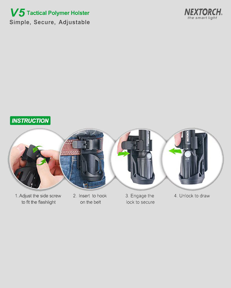 NEXTORCH Tactical Holster V5 är ett slitstarkt och funktionellt hölster för ficklampor, utvecklat för att ge smidig åtkomst och hög flexibilitet. Den roterbara konstruktionen möjliggör 360 graders justering, vilket gör att lampan alltid kan placeras i optimal position. Hölstret är kompatibelt med ficklampor som har en diameter på 25–32 mm och kan fästas på bälten med en bredd på upp till 50 mm. Tack vare det integrerade snabbfrigöringssystemet kan lampan dras snabbt vid behov. Tillverkat i tålig svart plast för pålitlig och diskret användning i krävande miljöer.