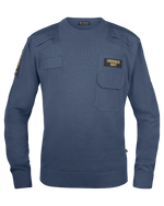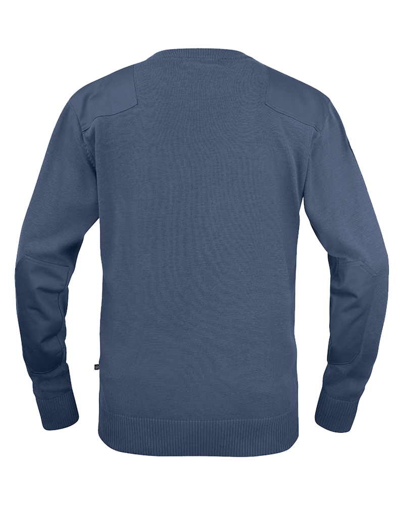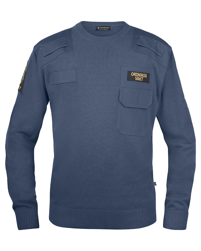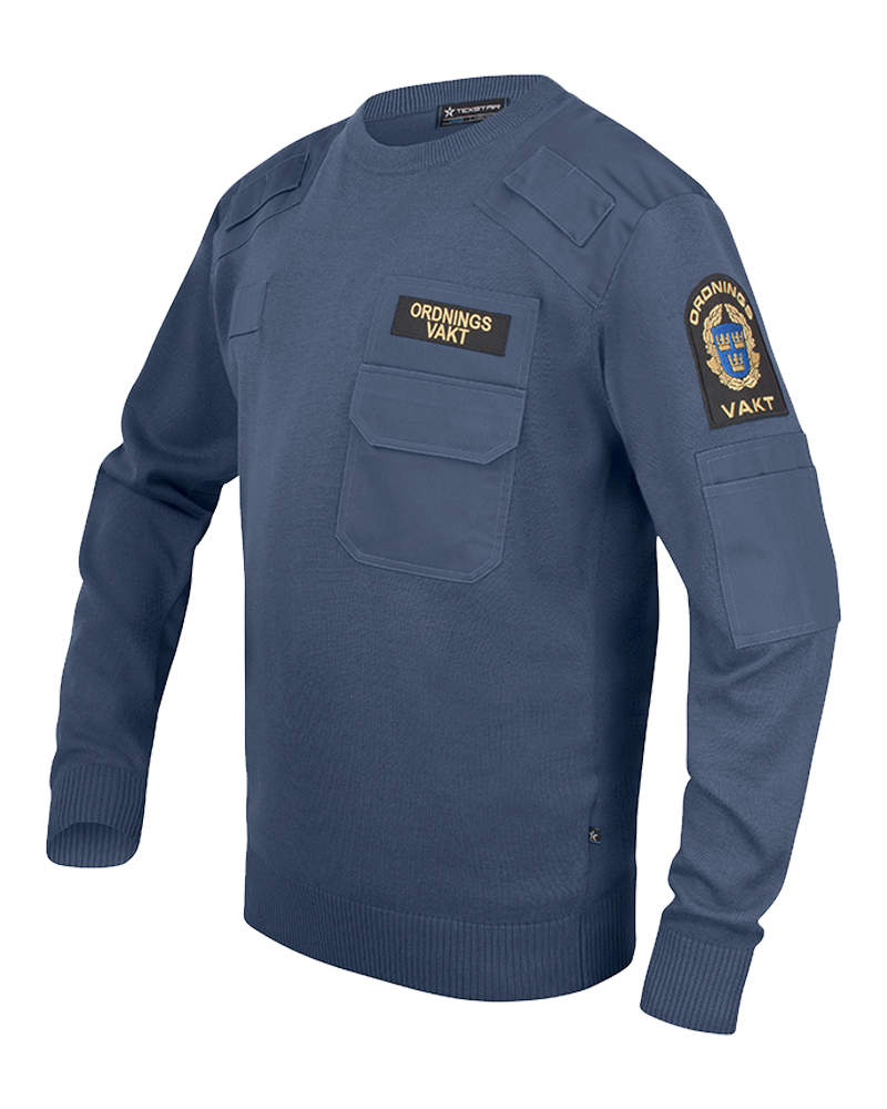 Klassisk natotröja med ribbstickad rund hals. Bröstficka med lock och pennficka på vänster arm. Förstärkta axelparti och armbågar. Monofonhållare på höger och vänster axel. Namnhållare höger bröst. Ordningsvaktsemblem på båda ärmar. Funktionsbeteckning vänster bröst. Den blå färgen är godkänd NCS 7015-R90B enligt Polisens FAP 670-1 (PMFS 2017_12).