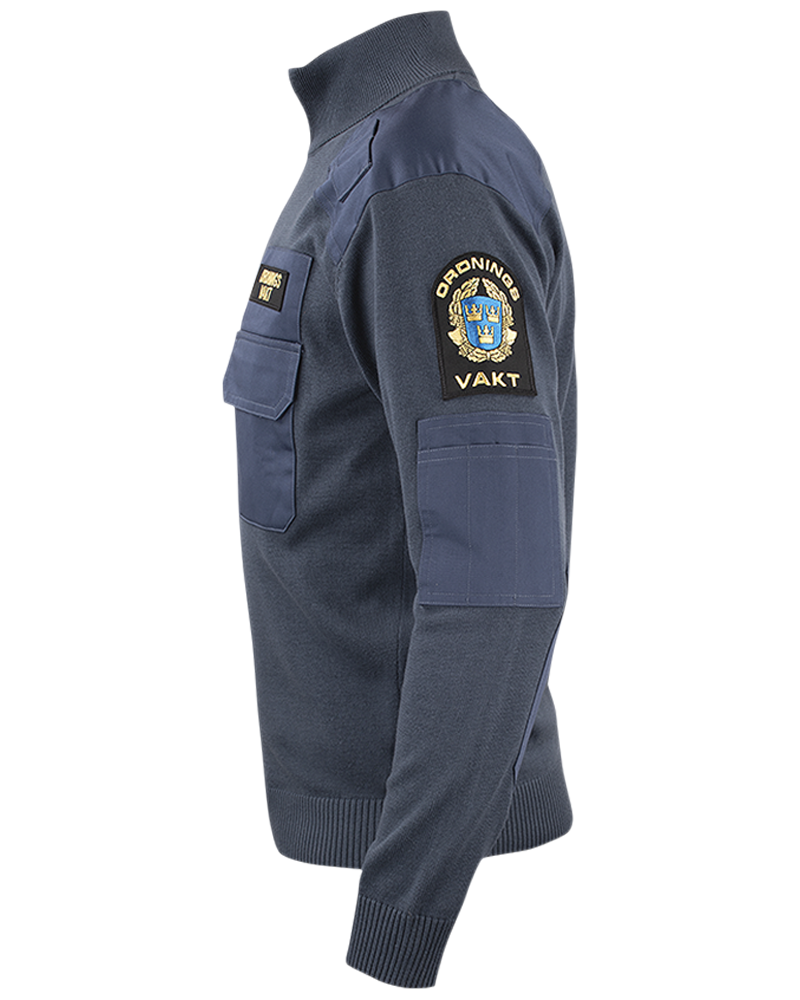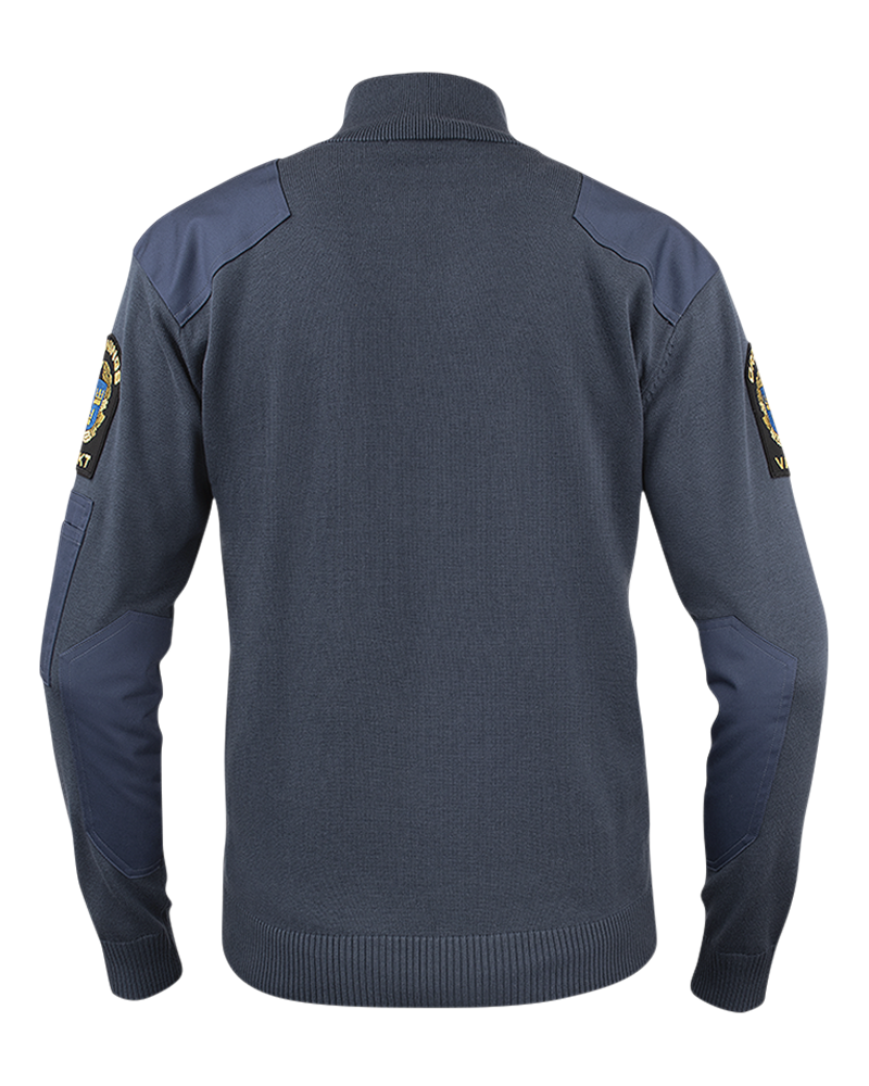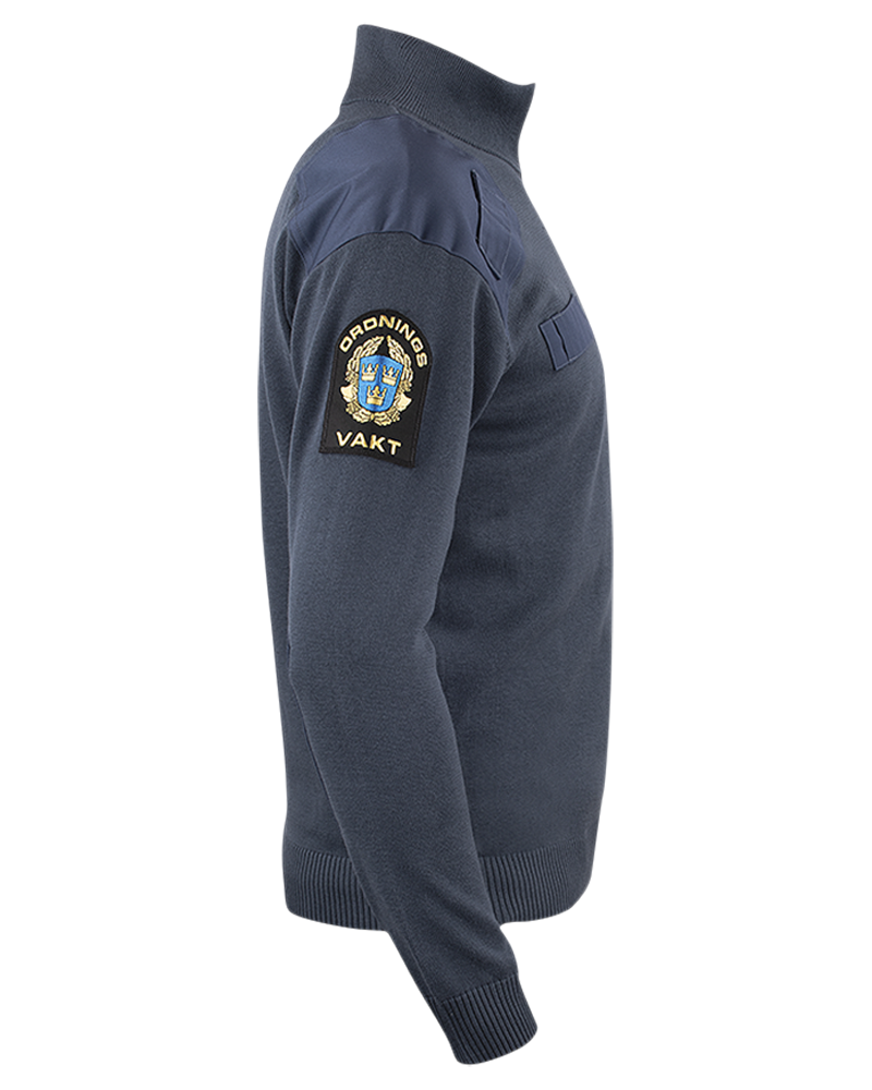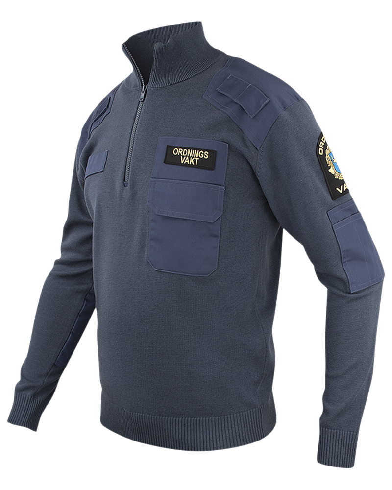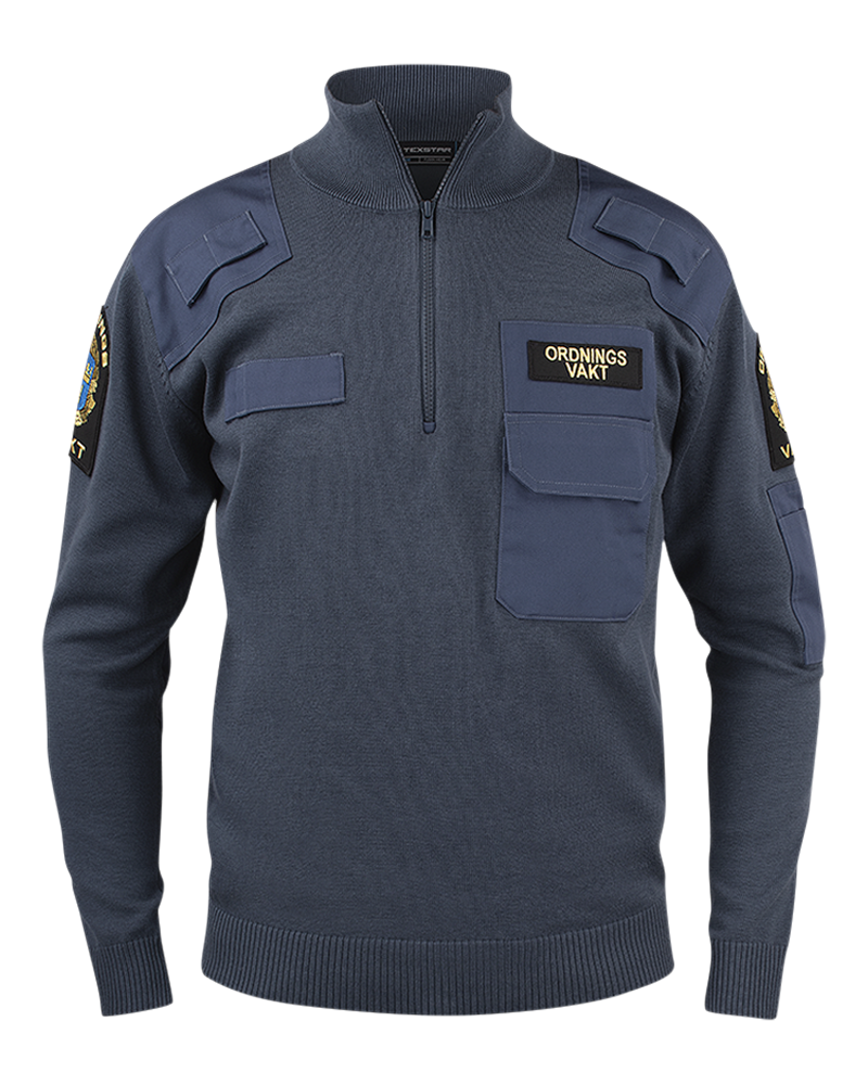 Snygg natotröja med dragkedja och hög krage. Ribbstickad i ärmslut och nederkant. Bröstficka med lock och pennficka på vänster arm. Förstärkta axelparti och armbågar. Monofonhållare på höger och vänster axel. Namnhållare höger bröst. Ordningsvaktsemblem på båda ärmar. Funktionsbeteckning vänster bröst. Den blå färgen är godkänd NCS 7015-R90B enligt Polisens FAP 670-1 (PMFS 2017_12).